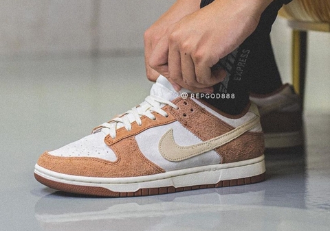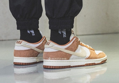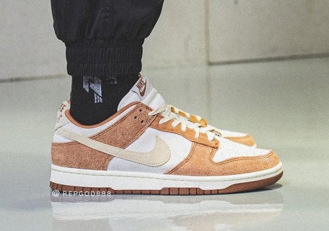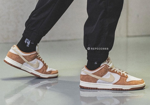 Phối màu lần này sẽ mang tên Medium Curry – tức cà ri loại trung bình? Dù gì thì tone màu curry lần này cũng có ánh cam nhiều hơn là ánh vàng so với những phối màu Curry trước, mang đến vẻ ngoài dịu dàng nhã nhặn hơn cho thiết kế Dunk Low này. Để tăng tính tương phản, những chi tiết như mũi giày hay mid panel mang tone màu trắng tinh, trong khi đó dấu Swoosh lại là màu Beige trung tính. Ngoại trừ lưỡi gà bằng nylon, gần như toàn bộ thân giày đều được làm từ suede xù lông trông cực kì chất lượng. Phần đế ngoài chuyển đậm hơn về tone nâu đất, có lẽ sẽ hạn chế được các vết bẩn trông thấy.