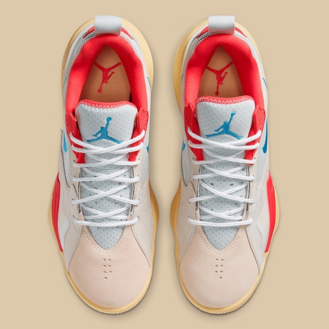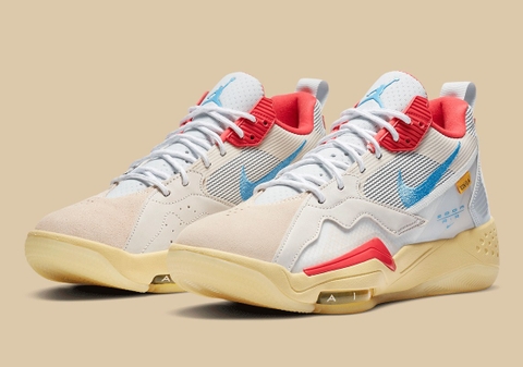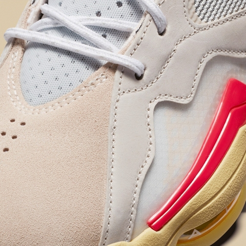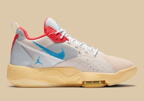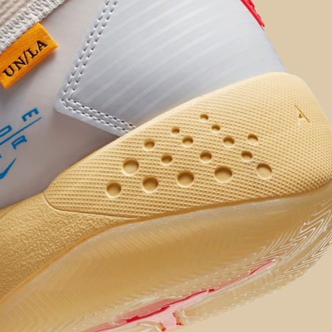 Bảo là lạ thì cũng không hẳn là lạ, vì Jordan Zoom ’92 lấy cảm hứng khá nhiều từ đôi Air Jordan ra mắt năm 1992: Air Jordan 7, với những chi tiết tương đồng như toe box, nẹp lỗ xỏ dây, badge tam giác ở gót giày… Đội ngũ thiết kế của Jordan Brand đã làm tốt để mang âm hưởng hiện đại lên một ý tưởng cổ điển, và phối màu Guava Ice – vốn thật lòng mà nói không quá đẹp trên Air Jordan 4 – lại tỏ ra rất phù hợp với thiết kế này. Một số điểm nhấn đáng chú ý có thể kể đến đó là chiếc tag UN/LA màu vàng “thương hiệu”, dấu Swoosh và Jumpman lưỡi gà màu Brigade Blue, viền cổ giày, viền lưỡi gà và badge gót giày màu đỏ trên nền giày trắng off white. Cung cấp sự êm ái cho thiết kế này là bộ đệm Zoom với hai Zoom unit size lớn đặt ở phần mũi chân.